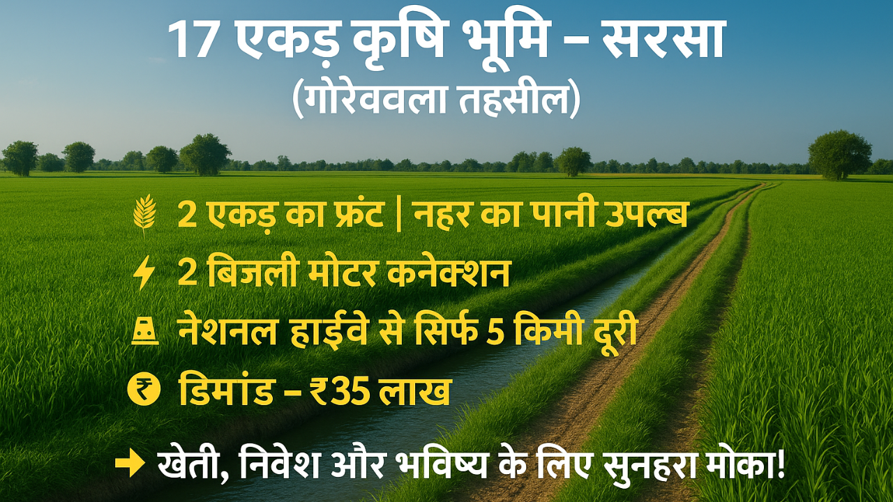 🔹 17 एकड़ कृषि भूमि – सिरसा (गौरीवाला तहसील) 🌾 2 एकड़ का फ्रंट | नहर का पानी उपलब्ध ⚡ 2 बिजली मोटर कनेक्शन 🛣️ नेशनल हाईवे से सिर्फ़ 5 किमी दूरी 💰 डिमांड – ₹35 लाख 👉 “खेती, निवेश और भविष्य के लिए सुनहरा मौका!”